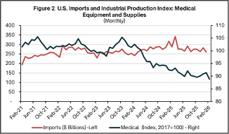 Foreign medical devices and components have partially replaced U.S.-made products. As shown in Figure 2, the value of imports of medical equipment and supplies remained flat through 2025, despite exposure of certain products to Section 232 steel and aluminum tariffs under Chapters 90 (medical instruments), 94 (hospital furniture), and 84–85 (machinery/electrical equipment for medical settings). Products with metal housings/components, such as diagnostic or surgical instruments, are directly exposed to the Section 232 derivative lists[1].