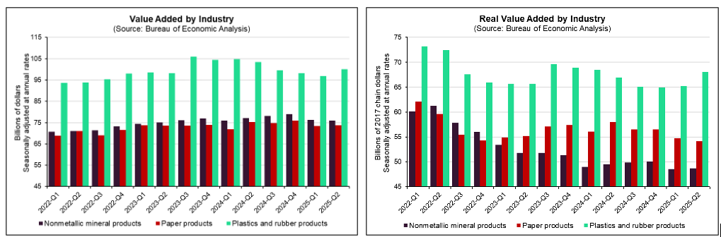 In the second quarter of this year, it was estimated that the inflation-adjusted value added of plastics manufacturing (based on plastics and rubber products manufacturing data) was $68.1 billion. This was 26% higher than that of paper products and 40% higher than that of nonmetallic mineral products, which include glass. Without adjusting for inflation, the value added of plastics manufacturing edged up from $96.7 billion in the first quarter to $100.1 billion in the second quarter, a 3.4% quarterly increase.