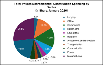 Against this backdrop, early 2026 data show a mixed start to the year in construction spending. It started on a softer note, edging down 0.3% month over month. On a year-over-year basis, spending rose 1.0%—a modest gain but still moving in the right direction. Of total construction spending, 75.8% ($1.66 trillion) is private construction, and the balance (24.2%) is public construction.