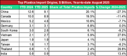 The top 10 U.S. plastics imports by country origin comprised 81.2% of U.S. plastics imports across the four main categories: plastics materials and resin, plastics products, plastics machinery, and plastics molds. The table below compares YTD trade data between 2024 and 2025.