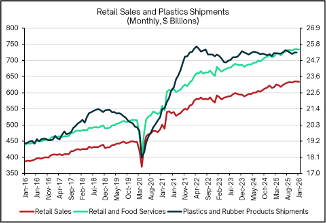 Key TakeawayThe strongest driver remains retail sales growth, which pulls plastics shipments along. Rising retail inventory relative to sales acts as a moderating or delaying factor, often slowing shipments until the overhang clears. In recent years (2023–2025), balanced inventories relative to sales help explain the steady (non-explosive) pace of plastics shipments despite solid retail growth.
