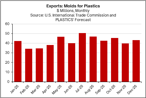 Based on monthly averages, U.S. mold exports, measured on a free-alongside-ship (FAS) basis in U.S. dollars, averaged $42.0 million in 2025—slightly higher than the $41.6 million monthly average in 2024. This increase in export value occurred even as higher tariffs raised production costs and heightened concerns about potential trade retaliation. Rather than reflecting stronger foreign demand, the higher export values largely stemmed from price increases driven by rising material and input costs in moldmaking. In contrast, export volumes declined sharply, with U.S. mold exports down 33.7% year-to-date through September compared with last year, indicating that higher prices offset weaker volumes. On a monthly basis, the U.S. Census Bureau reported exports of $42.6 million in September, while projections for October through December indicate a 6.5% rise in October, a 12.4% decline in November, and a 9.0% rebound in December.