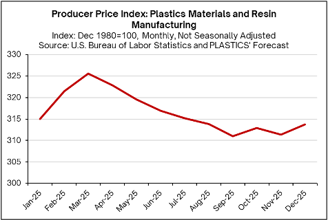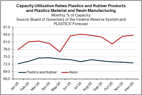 The capacity utilization rate in plastics product manufacturing declined throughout 2025, averaging 75.0% monthly in 2024 and falling to an average of 73.4% for the year, with December projected at 72.5%. This decline reflects the observed slowdown in plastics conversion activity over the year. Meanwhile, capacity utilization in plastics material and resin manufacturing averaged 81.7% in 2025—down from 83.5% last year—but has shown an upward trend during the year. December may have seen a slight increase of 0.4%. The combination of higher utilization in resin production and weaker demand is consistent with the decline in resin prices.