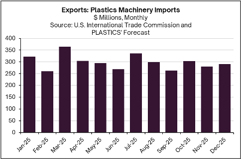 Through September 2025, total imports of plastics machinery and equipment rose 5.3% to $2.7 billion. While higher tariffs contributed to price-driven increases, their effects varied across machinery types. Injection-molding machine imports fell 2.4% to $539.8 million; extruders dropped 31.6% to $126.5 million, and blow-molding machinery surged 25.5% to $173.2 million. In quantity terms, injection-molding machines increased 7.1% to 7,976 units; extruders declined 16.1%, and blow-molding machines jumped 164.7% to 1,228 units, reflecting sharp cyclical adjustments in response to supply, demand, and tariff pressures. Projected fourth-quarter import values—$302.8 million in October, $279.1 million in November, and $290.2 million in December—suggest that total imports likely rose about 3.8% in 2025 underscoring, continued volatility shaped by tariff pressures and plastics machinery-specific dynamics.