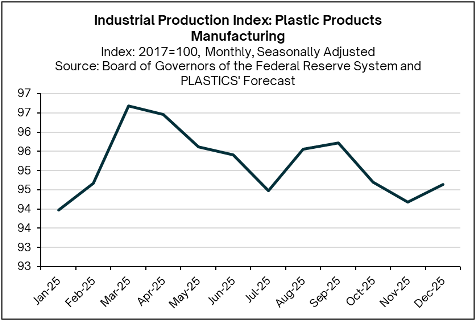 Looking ahead to 2026, the plastics industry should keep three key considerations in mind. First, the economy will operate in an environment of lower interest rates, with the Fed funds target now at 3.50%–3.75% with the additional rate cuts – depending on how employment and inflation data evolve. Higher rates above 4.0% since 2023, which peaked at 5.50%, contributed to an interest-rate–driven manufacturing slowdown, directly and indirectly affecting plastics production through weaker end markets. However, it should be noted that changes in monetary policy operate with lags. The effects of a lower benchmark interest rate may take time to materialize, depending on the speed at which lending rates adjust across the financial system. Second, tariffs will continue to exert uneven effects on the industry, even as U.S. trade agreements have lowered some reciprocal tariff rates. Finally, as a mature industry, the growth of plastics manufacturing will generally track overall U.S. economic growth. With the U.S. economy having expanded above trend for 18 consecutive quarters, 2026 is likely to see growth continue, albeit at a slightly slower pace—providing a cautiously optimistic backdrop for the industry.