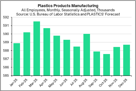 Based on monthly data, total employment in plastics product manufacturing is estimated to have peaked at 591,500 in March 2025 before declining over the subsequent four months, consistent with the contraction in plastics production. Following a brief increase in August, employment pulled back again in the remaining months of the year. In October, employment was estimated at 587,600 and likely rose modestly to above 588,000 in November and December.